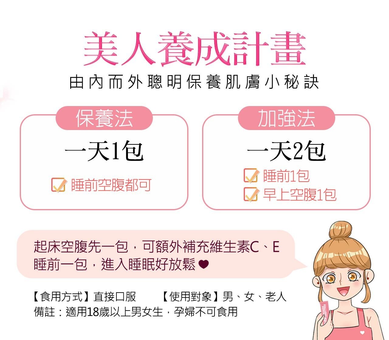 | [使用方式] | 每天1-2包,直接食用或搭配開水食用 |