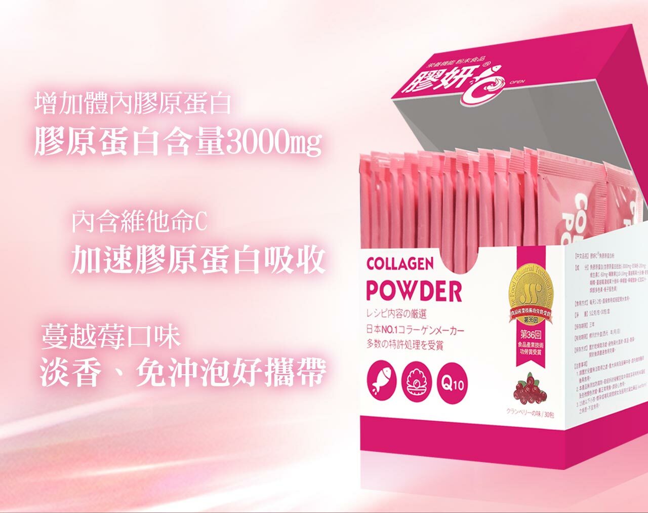 | [成分] | 魚膠原蛋白(含膠原蛋白胜肽)-3000mg、珍珠粉、維生素c、輔酵素Q10、蔓越莓果汁 |
